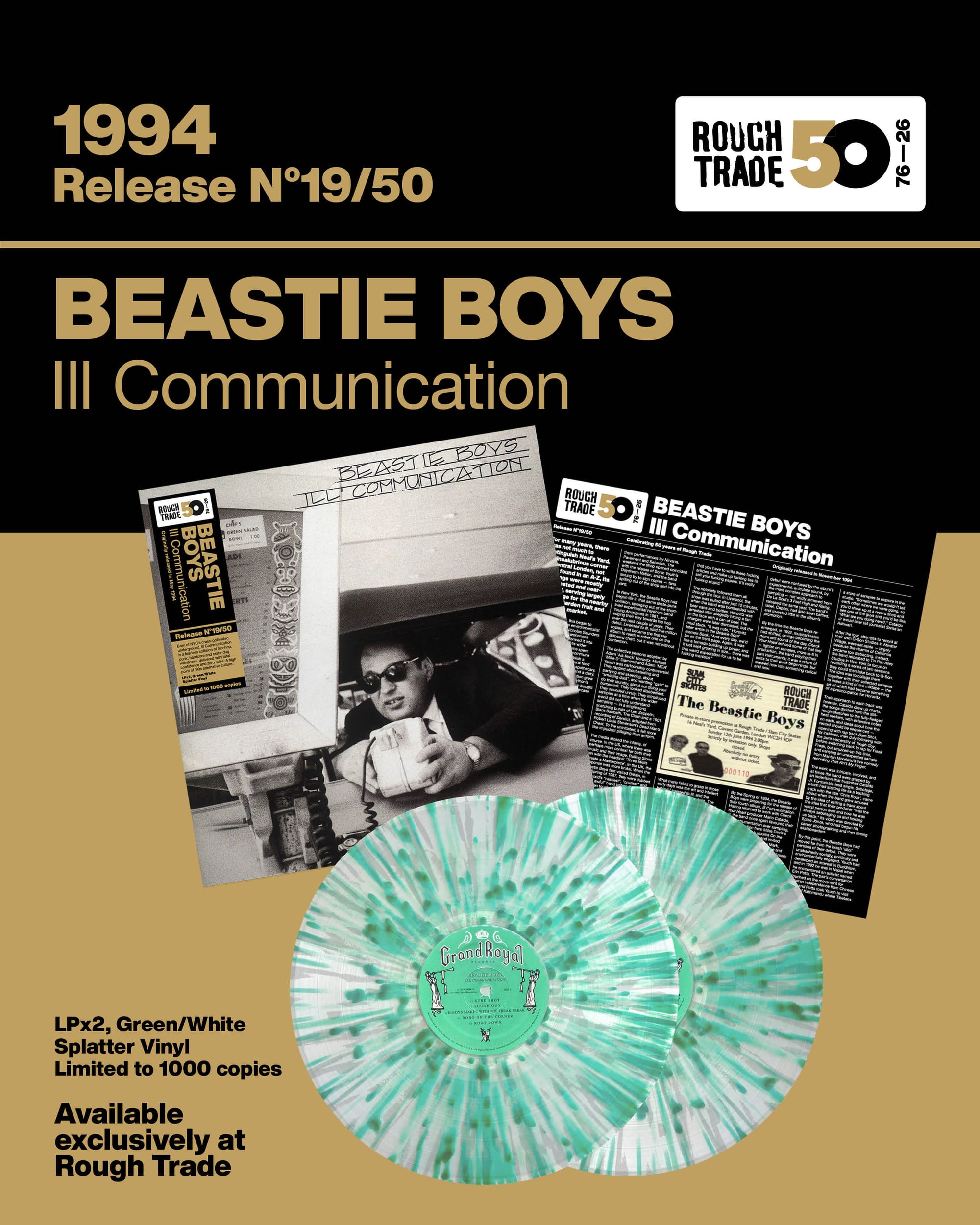 Emerging during hip-hop’s golden era, Beastie Boys flipped the perception of what rap could sound like on its head, channeling raw rock energy whilst also flexing serious musicianship and eclecticism through colourful jazz-funk instrumentals. Addressing environmentalism, the Tibetan freedom movement and inner peace Ill Communication saw Beastie Boys operate with a punk authenticity which established them as icons of both alternative hip-hop and indie scenes. Rough Trade are lucky to have shared a very special moment with the legendary hip hop group when they played an intimate gig at the former store in Covent Garden, on June 12, 1994. Located in the basement of Slam City Skates, the space hosted about 50 people for this promotional appearance - an unforgettable highlight in Rough Trade history.