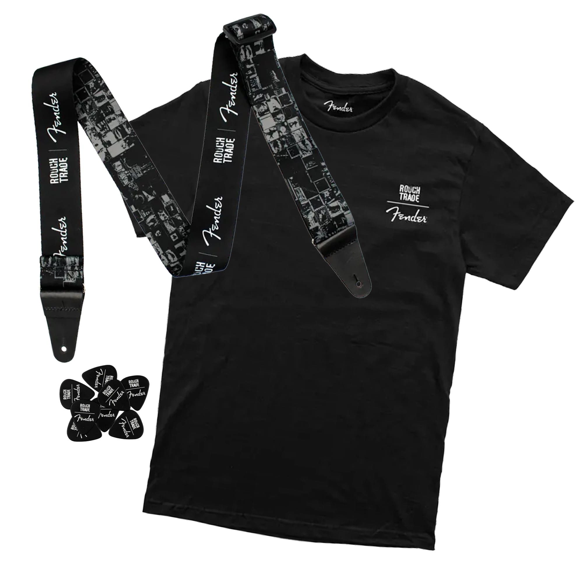 Icons of music collide - grab your limited edition merchandise from Rough Trade and Fender. Either an exclusive t-shirt designed in collaboration with Fender, 100% cotton with the Fender spaghetti x Rough Trade logo design. Or pick up an exclusive guitar strap designed in collaboration with Fender. Featuring our iconic 7" wall graphic from Rough Trade West, style and a slice of history alongside.