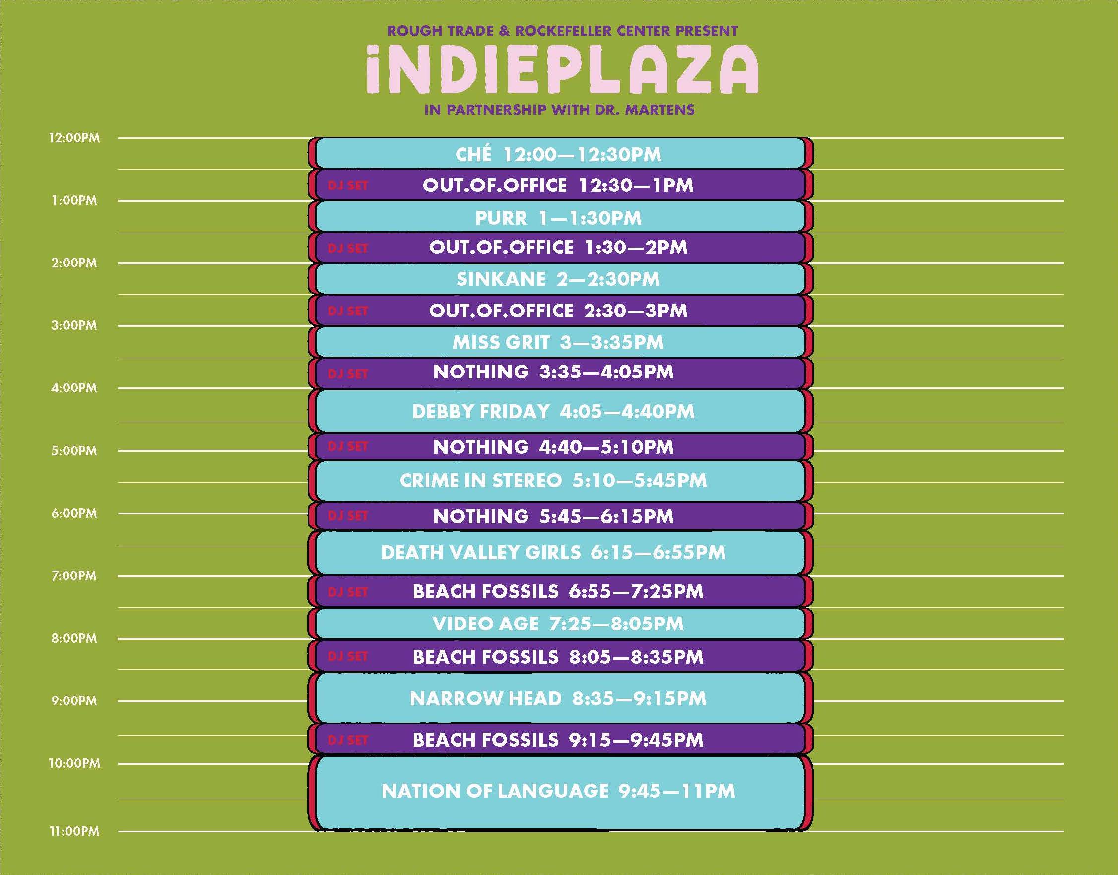 The second indieplaza festival will be held on September 9th 2023. Presented by Rough Trade and Rockefeller Center, in partnership with Dr. Martens. Nation of Language will headline in advance of their highly anticipated third album Strange Disciple. indieplaza will also spotlight some of the buzziest, up and coming artists in music today including Shoegaze Punks, Narrow Head; indie rock & pop duo, Video Age; Cali garage rockers, Death Valley Girls; Long Island hardcore band, Crime In Stereo; Electronic pop chameleon, DEBBY FRIDAY, and many more.