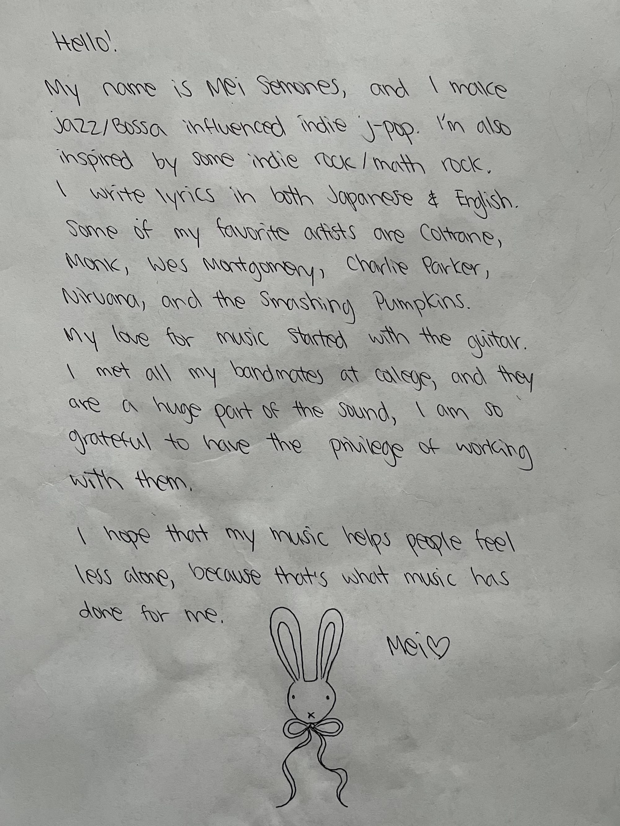 Mei Semones’ sweetly evocative blend of jazz, bossa nova and math-y indie rock is not only a way for her to find solace in her favorite genres, but is an intuitive means of catharsis. Plinking guitar tones and asymmetrical time signatures exemplify her forays into angular indie rock more now than ever before, especially on her debut Bayonet Records single “Wakare no Kotoba”—its wide-interval arpeggios in odd meters being some of the most technically difficult guitar work Mei has ever implemented in her songwriting. Translated to “parting words'' in English, the self-described “anti-love song” serves as a farewell to a toxic friendship, complete with orchestral swells and crashing guitars.